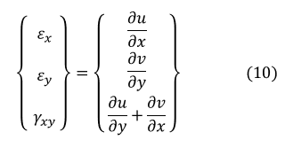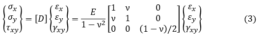 ひずみが求まれば,平面応力問題の応力は次式で求まります。[D]は応力-ひずみマトリクスです。