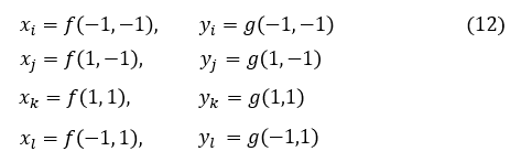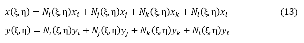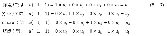 それでは,Ni(ξ,η),Nj(ξ,η),Nk(ξ,η),Nl(ξ,η)をどのような形にすればよいでしょうか。次式です。