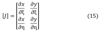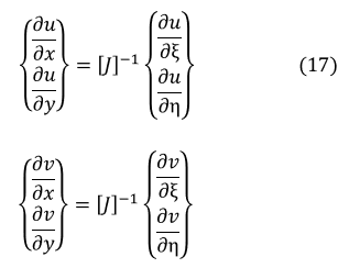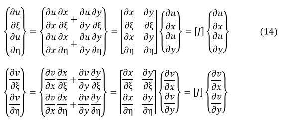 (10)式では,∂u/∂x,∂v/∂y,∂u/∂y,∂v/∂x を求める必要があります。しかし,∂u/∂ξなどは(8)式,(9)式から求められますが,xやyで偏微分したものはまだ計算できていません。