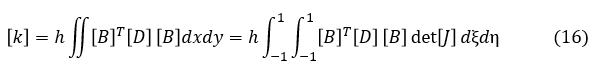 xとyは(13)式で示したようにξとηの関数なので,∂x/∂ξ,∂x/∂η,∂y/∂ξ,∂y/∂ηが求まります。よって,(2)式と(10)式を使って変位-ひずみマトリクス[B]が求まります。そして(16)式から要素剛性マトリクスを計算することができます。できるといってもこの積分は容易ではありません。積分は解析的に行うのではなく数値積分で行います。