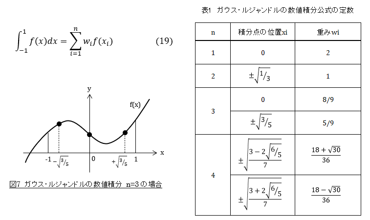数値積分の方法を1次元の場合で説明します。関数f(x)の定積分は次式で近似的に計算することができます。wiは重み,xiは積分点で,表1のような値となります。この方法をガウス・ルジャンドルの数値積分公式といいます。