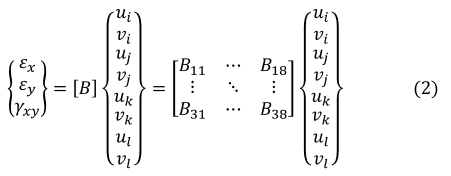 それでは2次元四角形1次要素のBマトリクスを求めましょう。Bマトリクスとは節点変位から要素内のひずみを求めるマトリクスでしたね。(2)式であらわされます。そしてひずみは次式であらわされます。