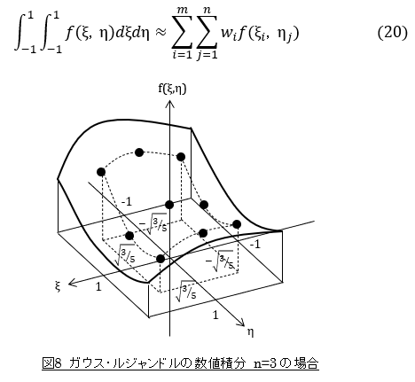 2次元問題での積分公式は次式となります。n=3を選択した場合,図8に示すように9点のf(ξ,η)を求めることで積分値が求まります。図示した点を積分点といいます。