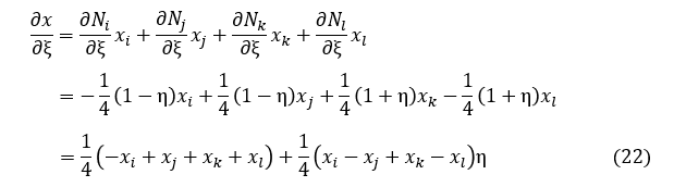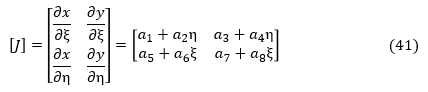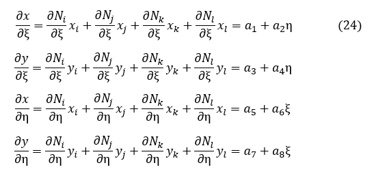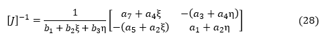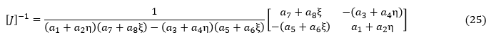上式に適切なξとηの数値を代入すれば,[J]-1が求まります。後の考察のために[J]-1を数値化せずにξ,ηの関数として表して,[B]の成分もξ,ηの関数として表してみましょう。(18)式に(24)式を代入します。