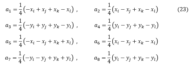 ここでxi,xj,xk,xlは節点座標値であって定数なので,a1,a2,a3,a4,a5,a6,a7,a8を次式で定義します。