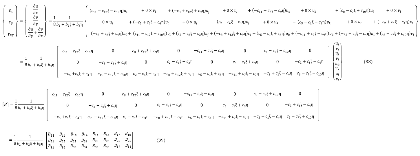(37)式を(10)式に代入すると[B]マトリクスができあがります。以下に示します。