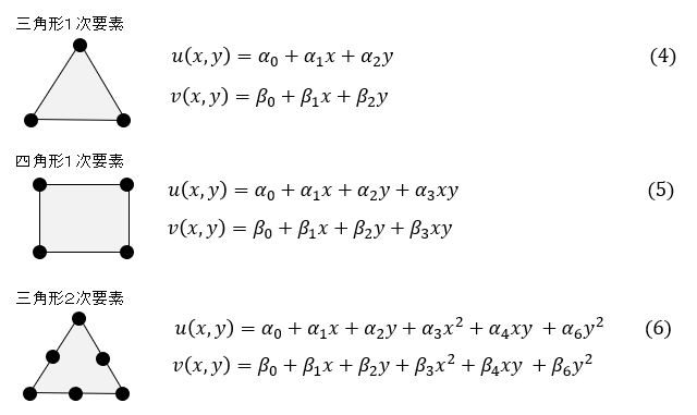 有限要素法では未知数である変位を簡単な式(1次式か2次式)で仮定します。以下に示します。