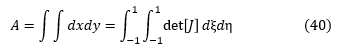 文献1)では,「変位法による弾性問題の有限要素解析では,積分の精度が要素体積を厳密に計算するうえで十分であれば,解の収束が得られる。」とあります。しかし今は2次元問題を議論しているので要素面積となります。要素面積Aは次式で表されます。