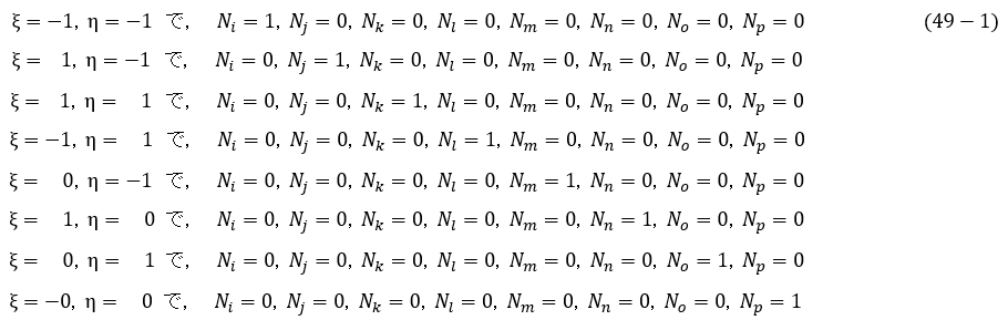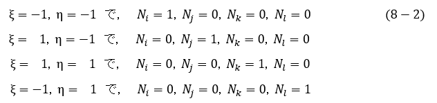 Ni(ξ,η),Nj(ξ,η),Nk(ξ,η),Nl(ξ,η)を形状関数といいます。それでは形状関数の形を決めるわけですが,下記条件が成立すれば都合がいいですね。