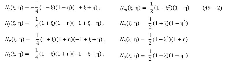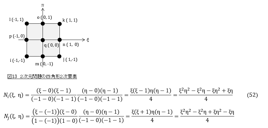 2次元四角形2次要素の場合,節点のレイアウトは図13のようになり,節点iの形状関数は次式となります。(50)式,(51)式で使っているi,j,m,nと以下の図と式で使っているi,j,m,nとは,意味が全然違っていることに注意してください。