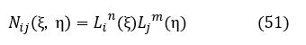 上式はi番目の節点(ξ=ξi)で1となり,i番目以外の節点(ξ≠ξi)で0となりますね。2次元問題での形状関数は(50)式を2つ用意し掛け算することで得られます。次式となります。