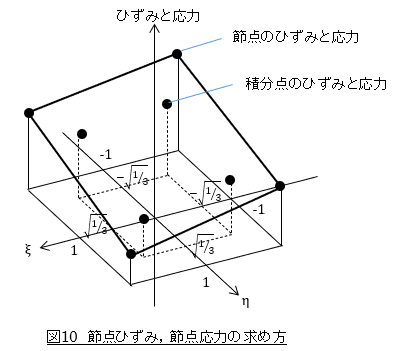 節点ひずみと節点応力は図10に示すように外挿して求めます。
