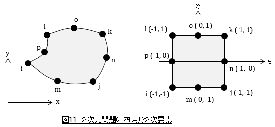 2次元問題の四角形2次要素は,図11に示すように辺の中点に節点があり,計8個の節点があります。