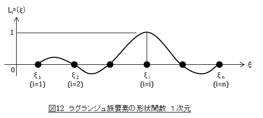 1次元の場合の形状関数を考えてみましょう。形状関数Lin(ξ)は図12のようにi番目の節点で1,それ以外の節点で0の値をとる必要があります。