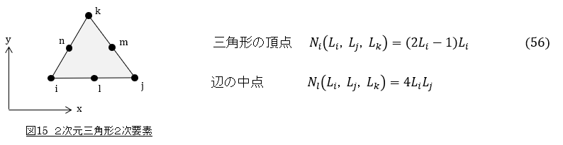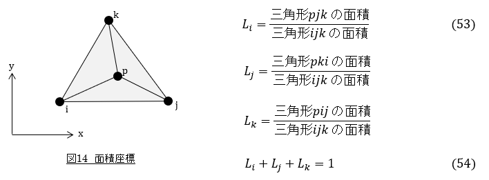 任意の3次元形状に対して6面体要素だけで要素分割する方法はまだ見つかっていません。解析業務では四面体要素が日常的に使われています。ここでは四面体要素の2次元版の三角形要素の形状関数を紹介します。三角形要素では図14と(53)式で示すような面積座標(Li,Lj,Lk)を導入します。3次元問題では体積座標になります。