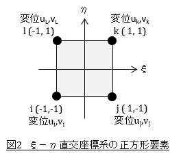 ξ,η直交座標系を導入し,寸法が図2のような正方形の要素を考えます。そしてi節点の変位を(ui,vi),j節点の変位を(uj,vj),k節点の変位を(uk,vk),l節点の変位を(ul,vl)とします。
