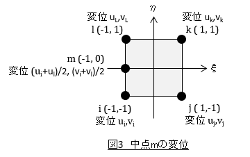 図3に示す中点m(ξ=-1,η=0)の場合を考えましょう。中点mのx方向変位が (ui + ul)/2,中点mのy方向変位が (vi + vl)/2となればなおさら都合がいいですね。なぜならば,mは中点なのだから節点mの変位は直感的に節点iと節点lの値の平均値であるべきだからです。