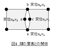 もうひとつ注目すべき点があります。節点mの変位が節点iと節点lだけで決まり,節点jと節点kの影響を受けないことで,隣の要素とで変位の連続性が保証されることです。図4を使って説明しましょう。位置cの変位は節点aと節点bの変位だけで決まります。一方,隣の要素の位置dの変位も節点aと節点bの変位だけで決まります。ということは位置cの変位と位置dの変位が等しくなります。つまり要素間での変位の連続性が保証されます。このような要素を適合要素といいます。
