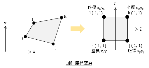 関数f(ξ,η),g(ξ,η)を積分領域が図6のように正方形で-1≦ξ,η≦1となるようにすれば,積分が楽になり都合がいいですね。当然ですが,次式が成立しなければなりません。