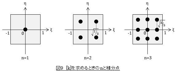 [B]が求まりましたのでガウス・ルジャンドルの数値積分公式を使って[k]を計算します。でもここで疑問が生じます。積分公式では2n-1次の多項式は厳密に積分できるのですが,今回の場合nをいくらにすればよいのでしょうか。n=1,n=2,n=3の場合の積分点を図9に示します。