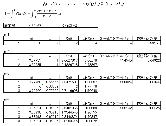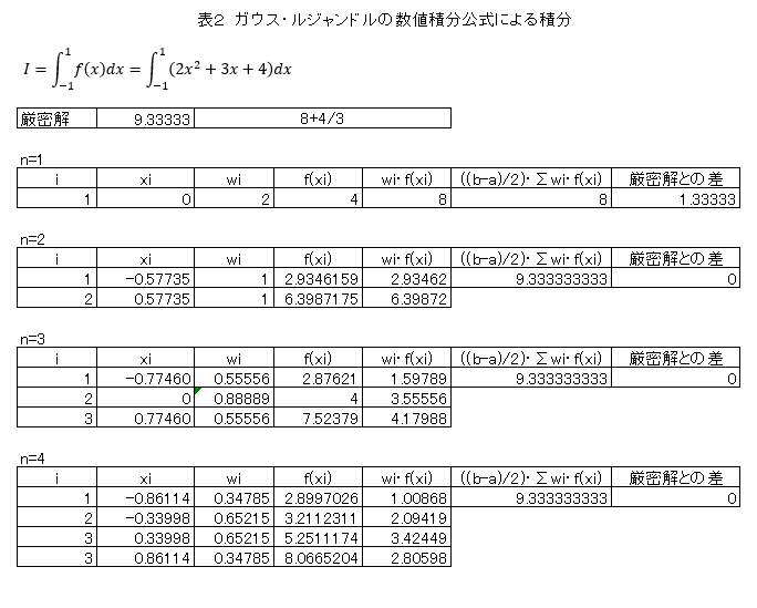 表2は2次の多項式の積分です。n=2,3,4で厳密解が求まっています。n=2の場合,2n-1=2*2-1=3 なので,n=2で十分です。