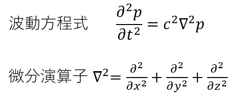 波動方程式を愚直に解く音響シミュレーションソフトウェアで騒音を予測します。波動方程式とは,圧力波(縦波)が音速で空気中を波として伝わる式です。以下に示します。