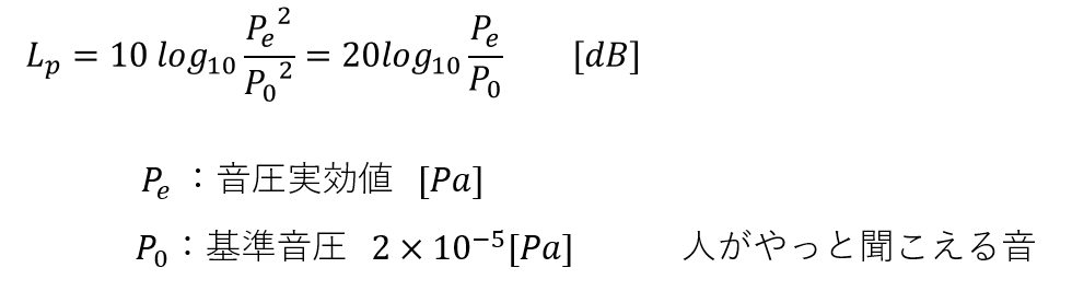 音圧レベル Lp(SPLsound pressure level)は次式で定義される音の大きさです。