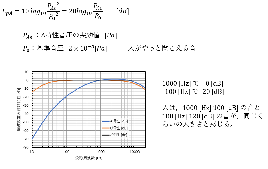 騒音レベル LpA(A-weighted sound pressure level)は次式で定義される音の大きさで,A特性のフィルタを通すことで人間の聴覚に近い特性を示します。通常は騒音レベルを使います。