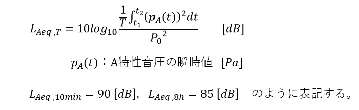 等価騒音レベル LAeq, T(equivalent continuous A-weighted sound pressure level) は,A特性のフィルタを通した音圧の実効値をデシベル表示したものです。騒音の大きさが変動するときに有効です。厚生労働省が定める騒音障害防止のためのガイドラインや環境省が定める騒音規制法を考慮するときに使用します。