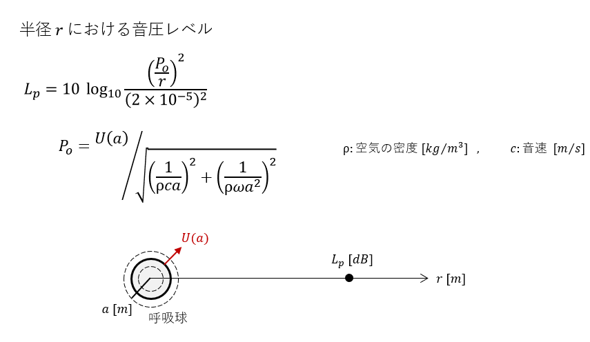 半径 a [m] の呼吸球の半径が速度振幅U(a)で変化しているときの音圧レベルLpは次式で表されます。