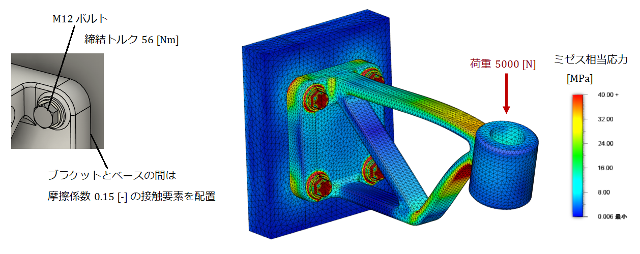 アルミ鋳物で制作したブラケットの応力解析です。ボルトはM12で,56[N.m]で締付けています。ブラケット本体とベースとの間には摩擦係数μ=0.15[-]の接触要素を貼り付けています。