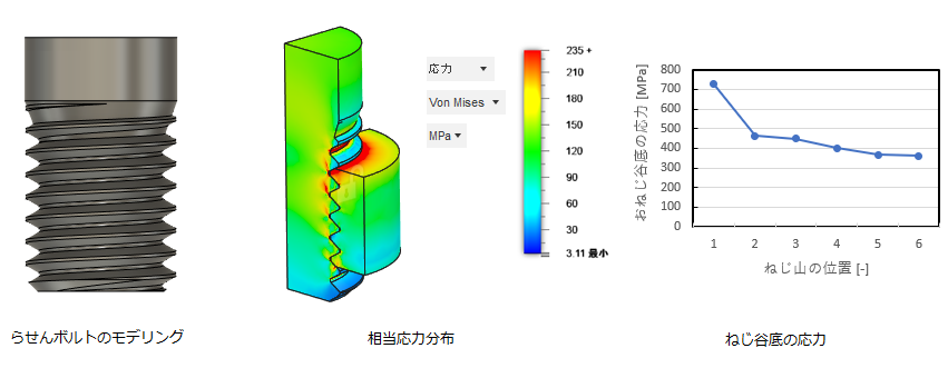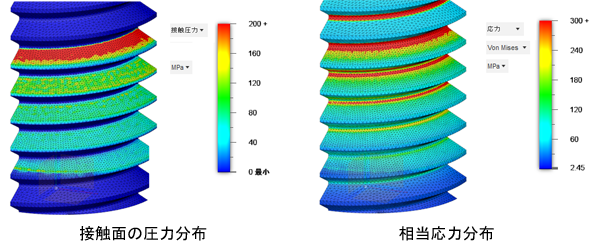 一般的にはねじの最初の3山が荷重を負担していると言われています。ねじ山接触面の圧力と相当応力図を見ますとそのように思われます。
