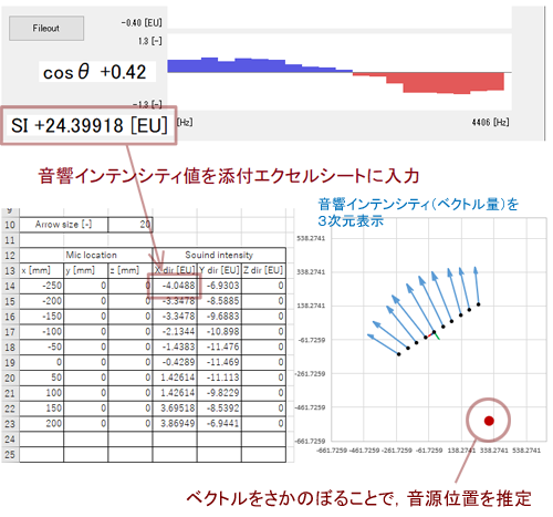 周波数成分表示,音響インテンシティ表示,音源位置推定マクロ付き Excelファイル