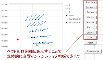 音響インテンシティ分布を回転表示できますので,回転することでベクトル群を立体的に把握できます。