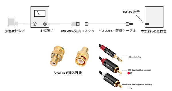 振動加速度など音以外の電圧信号の周波数分析,伝達関数測定は下記接続により可能です。ただし電圧上限は2.0 V程度となります。製品サポートの範囲外となります。